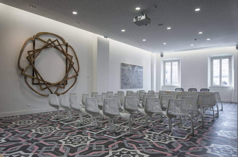 Il piano primo, con una superficie di circa 500 mq, ospita gli uffici della direzione, la segreteria, la sala riunioni, una grande sala per conferenze, archivi e locali tecnici, uniti tra loro da una “catena” di corridoi, slarghi e spazi di attesa di varia conformazione.
