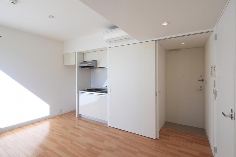 The south-facing units on the second and third floors feature an L-shaped layout with a balcony situated in a recessed section of the external wall. Despite the limited floor area, this design allows the bedroom and living areas to be both connected and distinct, introducing variety into daily life. From the living area, one can gaze out at the expansive scenery through a large opening set into the recessed section of the exterior. The serene bedroom, which draws in refreshing light and air through its tall, vertical openings, can be freely divided into separate spaces or joined together to form a single room using sliding doors.