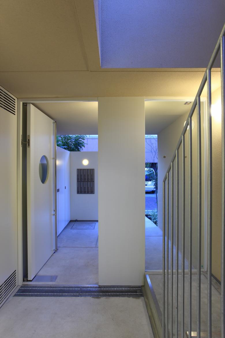 On a rectangular site extending east to west, a simple rectangular floor plan is arranged, with three units on each of the three storeys. The covered communal corridor and external staircase are compactly situated on the north side.