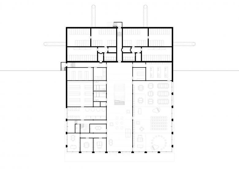 Das neue Oberstufenzentrum wird als kompaktes Volumen im südwestlichen Bereich des Projektperimeters positioniert. Als flächiges Gebäude nimmt es den Massstab der angrenzenden Sporthalle Rötschmatte auf. Zwischen den beiden öffentlichen Bauten liegt der bestehende Allwetterplatz als Bindeglied. Die kompakte Setzung des Neubaus erlaubt in einer späteren Etappe die Setzung eines weiteren Bausteines in der Zone für öffentliche Bauten. Das drei- bis viergeschossige Gebäude zeichnet mit seiner Höhenstaffelung die abfallende Topographie nach. Der Gebäudeeinschnitt zum südlich davorliegenden Ankunftsbereich markiert den Zugang des neuen Oberstufenzentrums und schafft eine klare Adressierung. Das Erdgeschoss wird mit den gesamtschulischen Nutzungen und den Empfangsräumen beim Haupteingang bespielt. Im 1.Obergeschoss sind die Fachklassenzimmer und der Lehrpersonenbereich untergebracht. Ab dem 2.Obergeschoss werden die 15 Klassenzimmer auf eineinhalb Geschossen angeordnet. Eine mittig liegende, grosszügige Freitreppe verbindet alle Geschosse miteinander. Der tiefe Gebäudegrundriss wird mit zwei mittig liegenden Patios, welche bis ins 1.Obergeschoss reichen, gegliedert. So werden die innenliegenden Erschliessungsbereiche mit natürlichem Licht versorgt und erhalten dadurch die Qualität von Lernzonen. Die nutzungsneutrale Gebäudestruktur ermöglicht dauerhafte Flexibilität und Anpassbarkeit, so dass unterschiedliche Unterrichtsformen von der heutigen Unterrichtsform bis zur offenen Lernlandschaft realisiert werden können.
