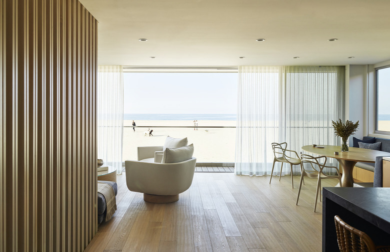 Located directly on the beach, this multi-family summer home involves three basic design concepts: Public Facade, Core Circulation, and Screening Neighbors. Facing the public street, a dominant brise soleil obscures views to pedestrians, but leaks sunlight to interior rooms. This fenestrated privacy feature is expressed on the facade as a volumetric mass floating above the recessed garage and dematerialized entry. Beyond the glass-box entry, a circulation core pierces all three-stories and isolates superfluous traffic to a center; the stairs are flooded with natural light from striated cuts above and vertical plate glass. The core is considered the connective tissue, both spatially and socially, as the stairs are frequented by family members. An adjacent elevator assists elderly family members between the first floor kids space, to common areas on the second level, and private quarters above. The client is an avid cook, therefore, the kitchen is strategically placed in close proximity with the living and dining area to energize the space and maintain the second floor as the programmatic center. A first floor walkout allows for easy beach access, while balconies on the top floors are flanked with screens to frame ocean views and grant privacy from nearby neighbors. The material palate perpetuates casual beach life through washed-out wood stains and crisp monochromatic colors coupled with smooth and textured finishes.