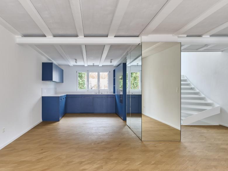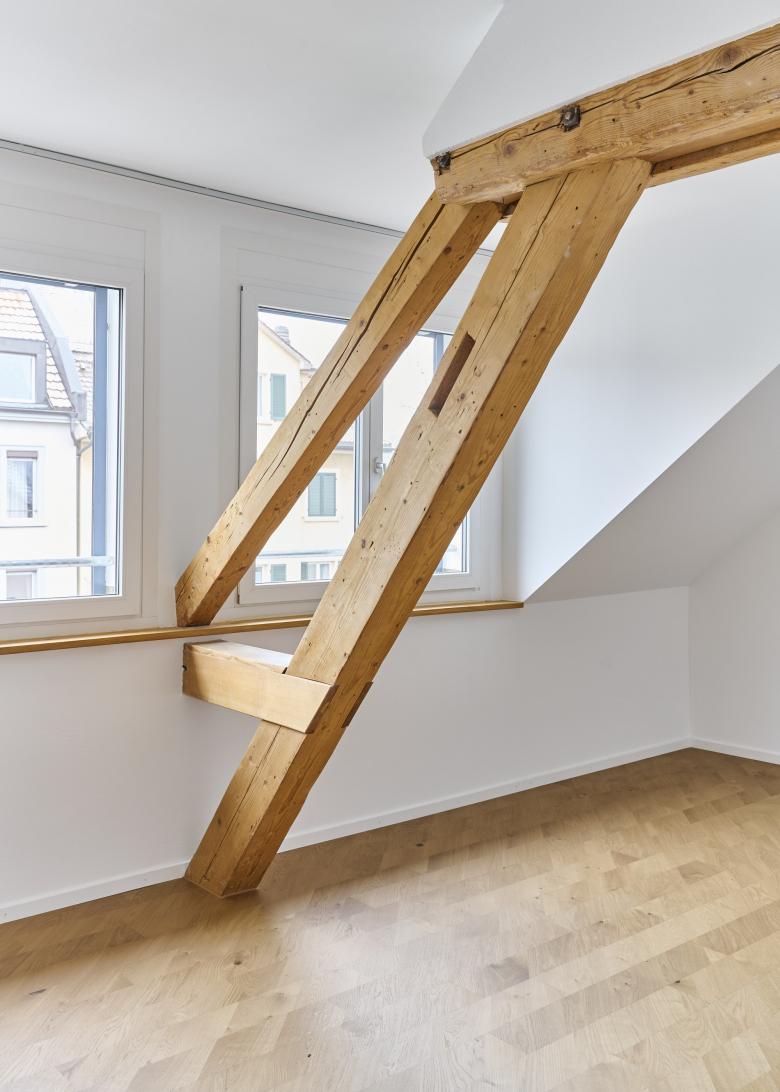 Zunächst wurde die bauliche Substanz gründlich ertüchtigt. Wegen des setzungsempfindlichen Uetliberglehms unter dem Gebäude musste die Fundation mit Mikropfählen verstärkt werden. Auch die Holzbalkendecken im Innern wurden erneuert und statisch verstärkt, um heutigen Anforderungen gerecht zu werden. Eine neue, filigrane Stahltreppe verbindet nun alle Geschosse und ersetzt das alte Treppenhaus durch eine leichte, offene Konstruktion.
