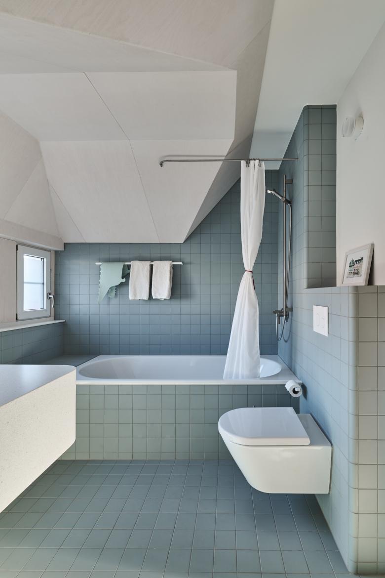 Ein zentraler Eingriff betrifft das zuvor kaum genutzte Dachgeschoss, das vollständig ausgebaut wurde. Aus zwei kleinen Kammern und einem WC entstehen zwei helle Kinderzimmer mit Galerieebenen, ein separates Bad sowie ein kompakter Arbeitsraum. Durch das Öffnen bis zum First, das Freilegen der Dachbalken und eine durchgehende Untersicht aus Birkenholz gewinnt das Dachgeschoss an Grosszügigkeit und räumlicher Qualität. Massive Fichtenbodenriemen und präzise gesetzte Dachfenster betonen den wohnlichen Charakter und sorgen für gleichmässige Belichtung.