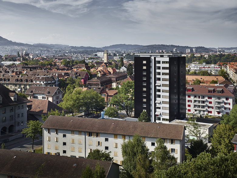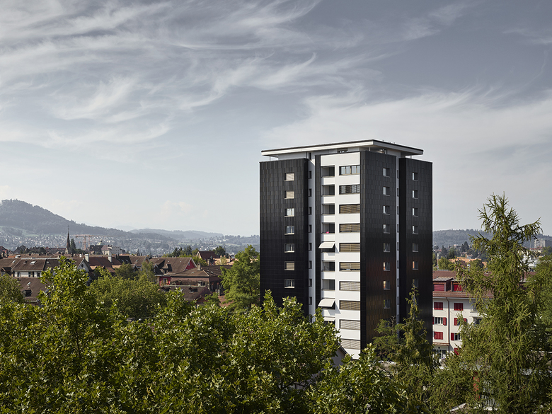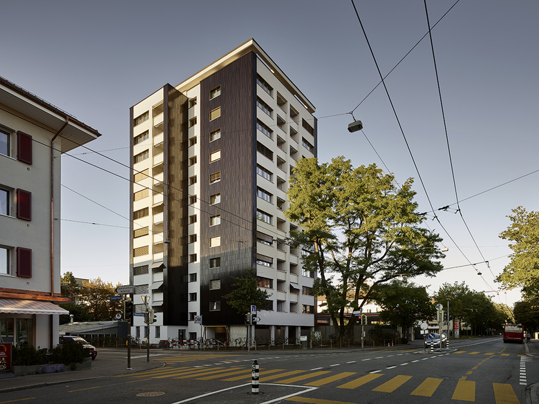 5 1⁄2-Zimmerwohnung im Attika. Im Rahmen der Totalsanierung werden die bestehenden 3 1⁄2-Zimmerwohnungen zu grosszügigen 2 1⁄2-Zimmerwohnungen neuorganisiert. Neben der gesamten Neuinstallation der Haustechnik, der Erdbebenertüchtigung, dem Ersatz der Liftanlage und der unterirdischen Anbindung an die Einstellhalle wird die Gebäudehülle komplett saniert. Die ursprüngliche Backsteinfassade wird mit einer hinterlüfteten Keramikfassade verkleidet, die zurückspringenden Fassadenbereiche erhalten eine Putzfassade. Die ursprüngliche Identität und der Ausdruck des Hochhauses werden gestärkt. Das Eingangsgeschoss, welches ursprünglich als Waschbereich diente, bietet nun eine Fläche zur Büronutzung