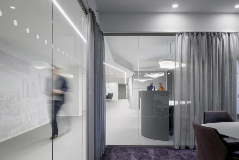 Die Mietfläche erstreckt sich in den drei Ober- und Dachgeschossen von zwei mit einer Brücke verbundenen Gebäudeteilen. Der großzügige Charakter der Bürowelt wird wesentlich bestimmt durch den Einsatz von raumhohen, rahmenlosen Glastrennwänden entlang der Erschließungszonen. In Kombination mit transluzenten grausilbernen Vorhängen entsteht so trotz der Kleinräumigkeit ein offenes Arbeitsumfeld. Die Vorhänge vermitteln Eleganz und Dynamik mit wechselnden Blicken durch die Büroräume und auf die Alte Oper.