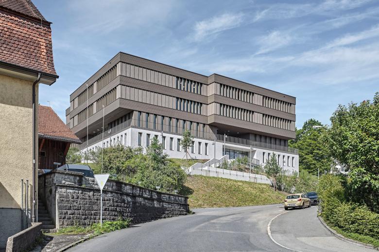 Auf einem von Grün umspülten Betonsockel erhebt sich leicht der dreigeschossig sich allseitig orientierende holzverkleidete Oberbau. Kräftige horizontale Holzbänder kontrastieren mit vertikalen Holzschwertern, welche im Sommer mit deren Verschattungspotential optimalen Wärmeschutz bieten.