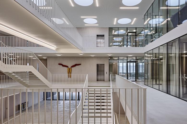 Das Raumprogramm ist auf vier Geschosse aufgeteilt. Zwei Klassengeschosse mit ausgedehnten Lernlandschaften, das Erdgeschoss mit den öffentlicheren Nutzungen und das Sockelgeschoss mit den Kreativnutzungen.