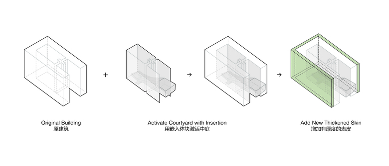 The design team began by analyzing the nearby context and realized that almost all of the nearby buildings were contemporary glass towers, defined by thin structures and thin glass façades. SLA decided that the AVIC Hotel design would distinguish itself architecturally from the nearby context via an oppositional strategy- it would have a thick facade and thick structure. The resulting volumetric facade, combined with the heavy existing concrete structure would set the building apart from its neighbors and would use the facade depth to include new programs and functions. In order to make the building responsive to its context, the new facade is different on all four sides.