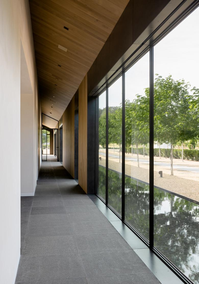 Materially, the project weaves in the unique character of its site and history into this pure form. These exterior walls are made from 100-year-old wine tanks from Mondavi, one of the valley’s pioneers in winemaking, and inside, the entry stair in the production department is built from the wood of oak wine barrels, the red stains purposefully left. The scent of wine permeates the space, until you step outside, when the scent of herbs from the raised gardens fills the breeze. Thinking of the central role water plays in the region, the near-net-zero-water facility is cut through by a reflective pool running alongside the tasting room; on sunny days, the pool reflects the landscape and architecture, bringing the project’s many layers of articulation – gravel, concrete, tree, siding, grass, glass, wood – together on a single plane.