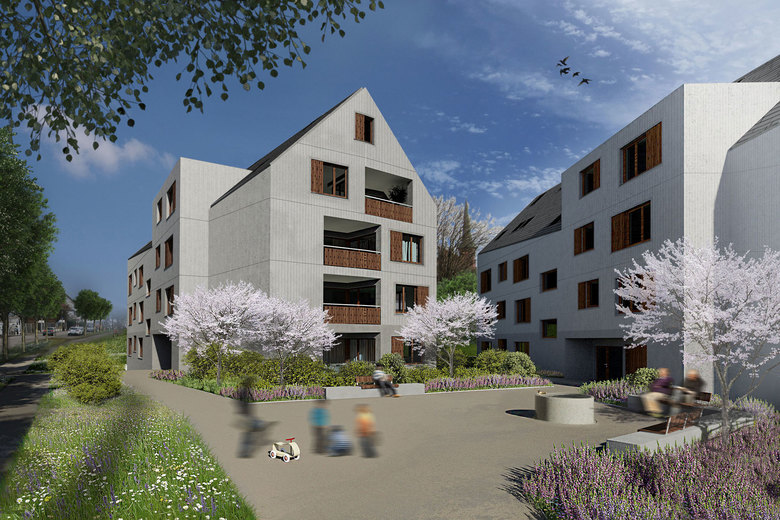 Eine Optische Reduktion der Fassadenhöhe auch durch Wechsel der Oberflächenstruktur in Anlehnung nahegelegener Bauten. Die Gebäudehülle ist komplett in Sichtbeton, mit glatter Struktur im EG und einer vertikalen Brettstruktur der Obergeschosse. Die Holzfenster mit den Holzschiebeläden werden als Element in die Fassade eingesetzt. Das Holzmuster der Schiebeläden und der Balkonbrüstungen nimmt ebenfalls den dörflichen Charakter auf.