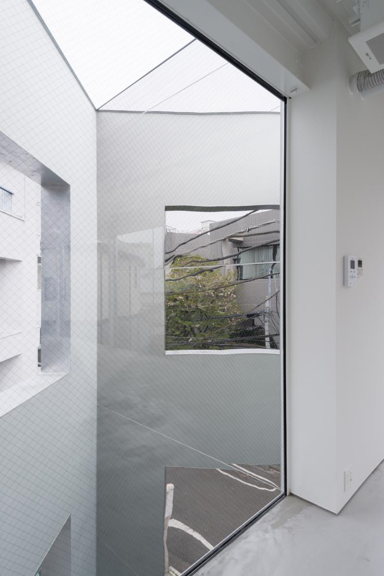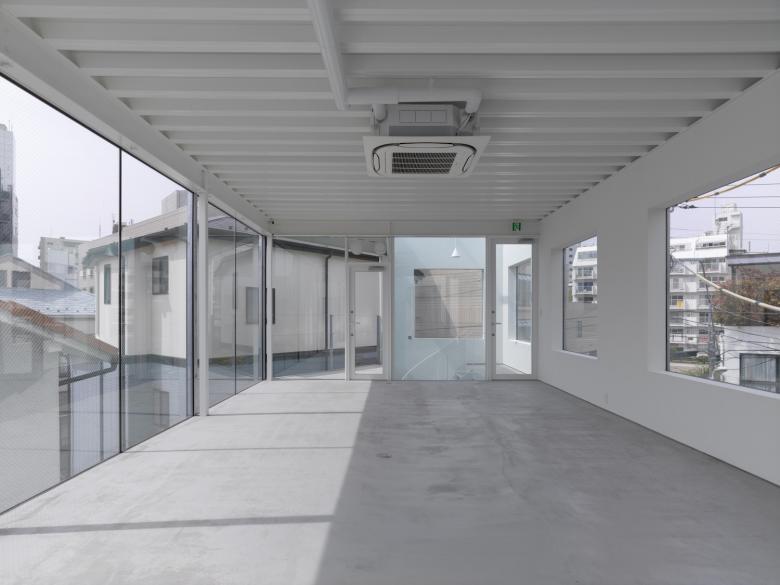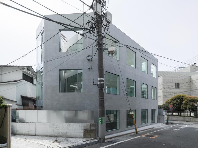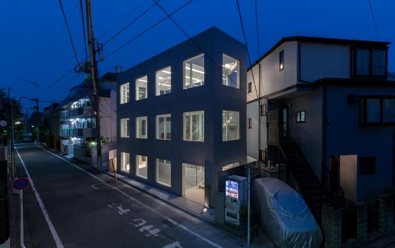 代官山の商業エリアから住宅エリアに変わるちょうど境に立つ商業テナントビルである。閑静な通りに対して住宅とも見えるような等間隔に並ぶ"明るい窓"のファサードとした。敷地形状から建物の奥行きがそれほど深くないので背面をガラス張りとすることで背面の建物や空が道路側の窓越しに見え、光が通りに漏れてくる。構造的(S造)に道路側と背面で在り方が分かれている。壁面量の多い道路側の面にほとんどの力を負担させ、背面は開放的にするため垂直荷重だけを負担する細い柱のみとしている。