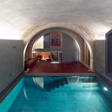 L’accès à la piscine intérieure, située sous un plafond voûté d’origine, se fait par une porte coulissante automatique puis par un deck en bois. Travaillé comme une grotte, le wellness comprend une sauna, un hammam et un bac d’eau froide, alimenté par l’eau de source de la propriété, ruisselant sur un mur de pierre.