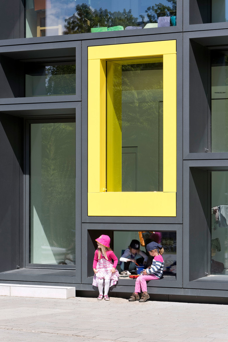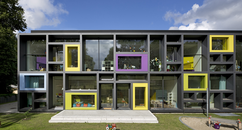 ADDED VALUE: Die bunten Fassadenrahmen werden zum gestaltprägenden Imageträger des neuen Kindergartens und bieten den kleinen Nutzern im Inneren differenzierte Raumelemente, die zum aktiven Spielen einladen.