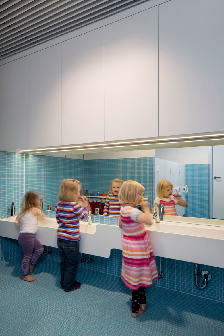 Der zweigeschossige Neubau liegt am Rande einer parkähnlichen Grünfläche des innerstädtischen Firmengeländes der Beiersdorf AG in Hamburg-Eimsbüttel. Der rechteckige Baukörper ist sehr kompakt um einen zweigeschossigen zentralen Mehrzweckraum organisiert, der als Spiel- und Aufenthaltsfläche dient. Inspiriert von der Historie der Beiersdorf AG, leitet sich das Erscheinungsbild der Kita Beiersdorf im abstrakten Sinne von der Funktionsweise eines Apothekerschrankes ab. Als regalartige Struktur kann die Fassade auf verschiedenste Funktionen und Anforderungen reagieren und lässt zugleich durch eine großzügige Verglasung der Gruppen- und Aufenthaltsräume ein helles und transparentes Ambiente entstehen, das beste Bedingungen zum Spielen und für die pädagogische Arbeit bietet. Eingeschobene farbige Rahmen gliedern und gestalten die Fassade nach Außen und bieten den Kindern Orientierung und Identifikation mit ihren Gruppen. Vom Innenraum aus nutzbar finden sie eine Ergänzung in abwechslungsreichen Spielelementen, die als Podeste, Boxen, Sitz- und Kletterobjekte den kindlichen Ideenreichtum anregen.