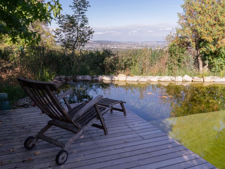 Einen besonderen Stellenwert sind auch der Verbindung und Differenzierung der verschiedenen Gartenbereiche zugekommen: Die großen Schiebetüren und Verglasungen im Erdgeschoss verbinden den Innenhof mit dem rückseitigen, großen Garten. Im geöffneten Zustand verschwimmt Innen mit Außen und je nach Bedürfnis kann man seinen idealen Ort wählen. Der Naturpool im hinteren Bereich des Gartens bietet einen weiten Blick über Felder und die Donau. Im vorderen Bereich zur Straße des Grundstückes steht ein graziles Flugdach, das als Carport verwendet wird. Auf den Altbaumbestand wurde sehr geachtet, die meisten Bäume konnten bei dem Bauvorhaben erhalten bleiben, und verteilt sich über das gesamte Grundstück. In der Verbindung aus Brettverschalung des neuen Hauses mit dem Baumbestand, fügt sich ich das Haus natürlich in die Umgebung ein. Und das alte Haus? Dieses wird als Gästehaus und Arbeitsatelier verwendet.