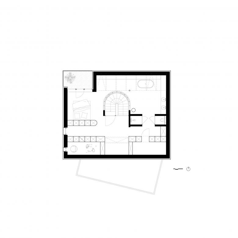 Vertikale Öffnungen verstärken diese Offenheit durch die Blickbeziehungen zwischen den Ebenen. Das Zentrum des Hauses markiert dabei der kreisrunde Ausschnitt in der Erdgeschossdecke. Unter diesen Öffnungen kann man vom Erdgeschoss durch das mittlere Geschoss mit den Kinderzimmern bis in das oberste Geschoss der Eltern blicken. Auf der mittleren Ebene ist in den runden Ausschnitt ein Liegenetz gespannt. Seitlich begrenzt wird der runde Ausschnitt durch Sichtbetonwände, deren Grundform auf einen runden Zylinder zurückgeht. Die Form des runden Zylinders zieht sich durch die beiden oberen Geschosse und schafft spannende räumliche Situationen und Details: er trägt die eingespannten Stufen ins oberste Geschoss und löst sich weiter in eine prismatischen Verglasung auf, die den obersten Bereich akustisch und thermisch abtrennen. Das oberste Geschoss ist wie das Erdgeschoss völlig offen gestaltet und mittels Einbauten und raumbildenden Möbeln in Zonen und Bereiche definiert.