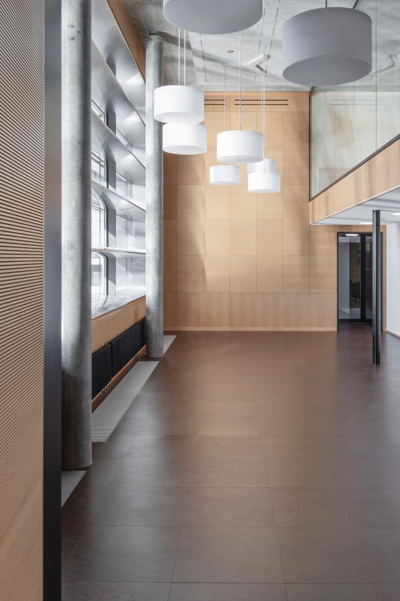 Aus Respekt zum Bestand haben wir das vorhandene Materialkonzept übernommen und weiter entwickelt. Sichtbetondecken mit roher Tafelstruktur und Wandverkleidungen aus Buchenholz prägen den Innenraum.