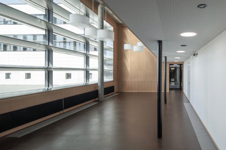 Der zweigeschossige Raum der Verkehrsleitzentrale wurde mit einer Galerie erweitert, welche sich mit genügend Abstand respektvoll von der bestehenden Fensterfront distanziert. Durch diese Massnahme bleibt die Zweigeschossigkeit im Bereich der Fensterfront weiterhin erlebbar. Die Nutzung der Galerie wurde der Sondereinheit FOKUS zugewiesen.
