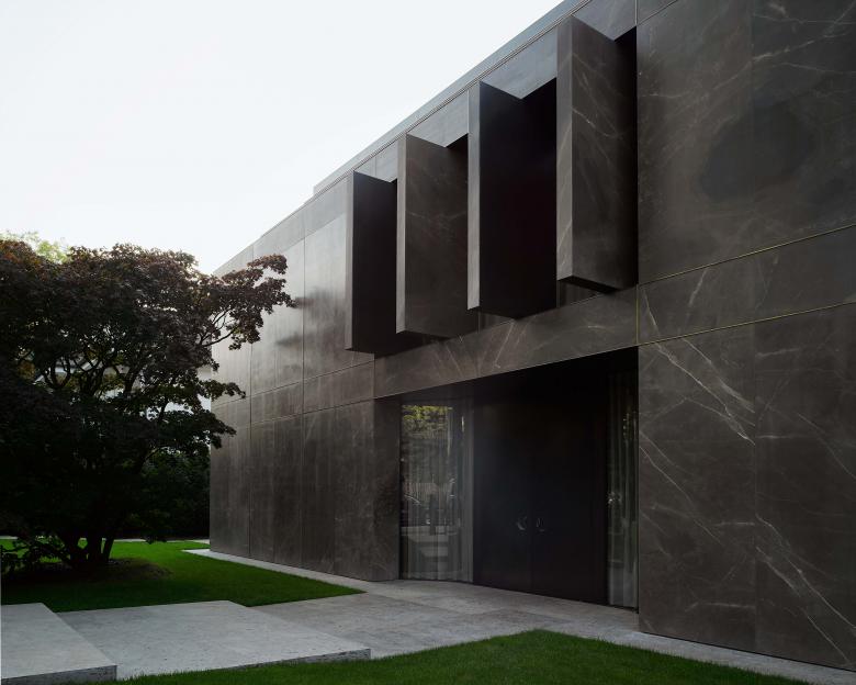 Because of its monumental facade facing the street, the house doesn’t require a wall or gate for privacy. The house stands free and fully visible while simultaneously offering privacy for the interior. The garden was designed with a natural chain of trees and bushes to create an array of lush green spaces around the house. An old Japanese Acer tree stands majestically in front of the imposing marble facade and creates a beautiful play of shadows on the sheets of natural stone. At the back of the house, the crowns from a group of Pinus sylvestris trees create a natural response to the stark horizontal lines of the balconies projecting into the garden.