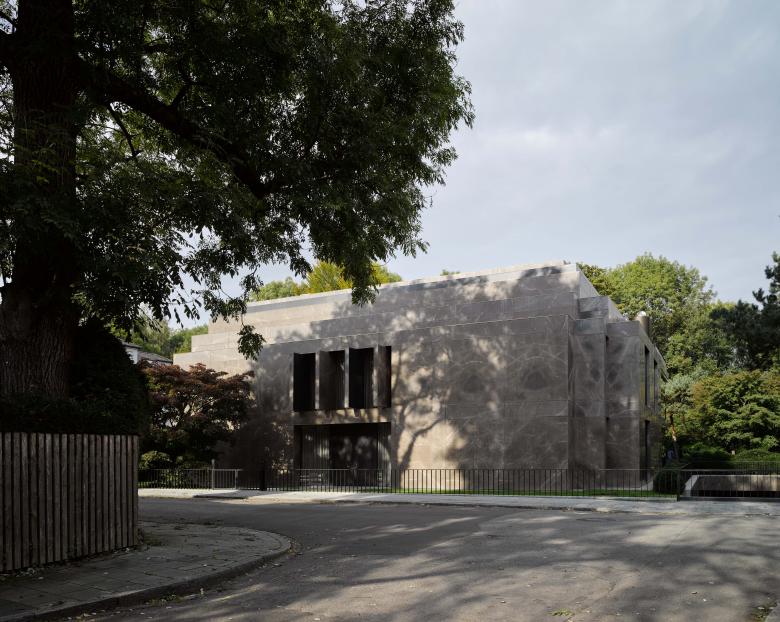 Towards the street, the house presents an imposing and monumental volume, structured in vertical slabs of ‘livre ouvert’ natural stone with fine brass lining. This facade is entirely closed, except for the solid patinated brass entrance doors and four marble panels on the first floor. These panels are motorized and can be opened, unveiling a singular large window that provides daylight to the corridor on the first floor. Towards the top of the house and the corners, the volume gradually pulls back, creating a staggering volumetric corner detail reminiscent of a proto-modern syntax. The solid exterior of the house gradually opens up toward the garden, as the wall mass becomes increasingly interrupted by glazed openings. The garden facade expresses itself as fully horizontal, with transparent surfaces and opaque bands soaring into large overhangs overlooking the garden.