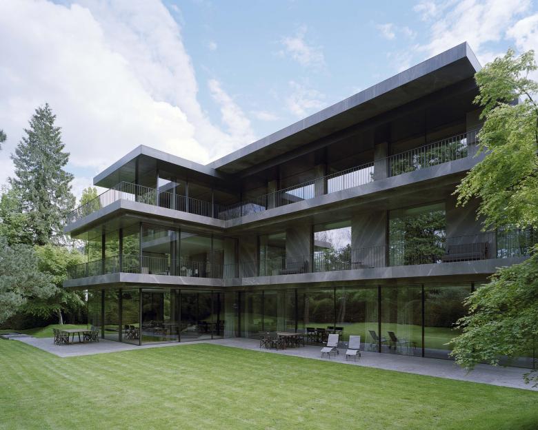 The relatively compact site of Villa B sits on the riverbed of the Isar in Munich with beautiful views of the river and evening sun. Situated in a row of walled plots with white stucco mansions, the owner commissioned Powerhouse Company to design a family villa and garden without a wall or fence, penetrated by the pure expression of material. Their vision for the project was a house that would be both monumental and private towards the street, yet open and informal towards the garden and views. A house made of earth-toned materials to contrast the immaterial whiteness of the ‘putzwerk’ of surrounding mansions. A modern version of a Munich monument, the city known for its monumental buildings with Italian and Classicist undertones and its pre-modernist architecture.