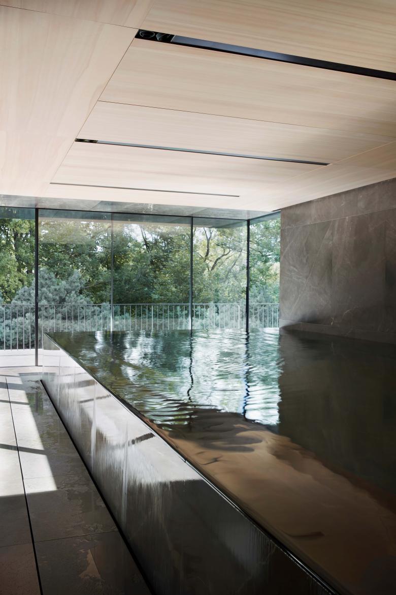 On the first floor, a long corridor stretches along the street facade, giving access to the bedrooms. Services are located in the mid-section of the building, forming a clear strip of elegant enclosed spaces while maximizing the garden views from each bedroom. On the lower floor, the logic of a coherent promenade from darker to luminous spaces is enhanced through a spatial sequence that ends in the large balconies with a river view. The second floor houses the pool and gym, also capitalizing on the spectacular views over the river and adjacent park. Water reflections blend the colors of the marble slabs and create an abstract and intangible space, while large glazed surfaces emphasize the continuity between interior and exterior. In the basement, the garage is designed as a wide hall with unconventional materials for its purpose: wooded walls and a natural stone floor. The curvilinear walls of the space form a ‘unicum’ compared to the orthogonal severe shapes of the villa: a dynamic and impressive entrance room or ‘rotonda’ for motorized access.