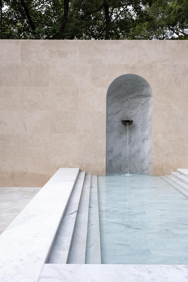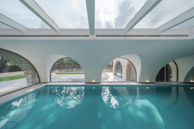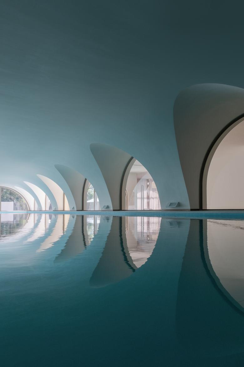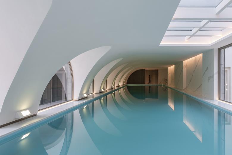 我们也对地下室原有的室内泳池进行了改造;由于建筑首层是抬高的,地下室和后花园处于同一平面。泳池三边拱廊设有大面玻璃窗,正如帕拉迪奥建筑中常出现的花园凉廊。新增的弧面吊顶使墙面和天花无缝相连,将视线灭点引向尽端花园里的雕塑和远处田园景色;端部的天窗间洒下阳光和树影,在吊顶拱面反射出水面粼粼波光,使人仿佛身处室外。