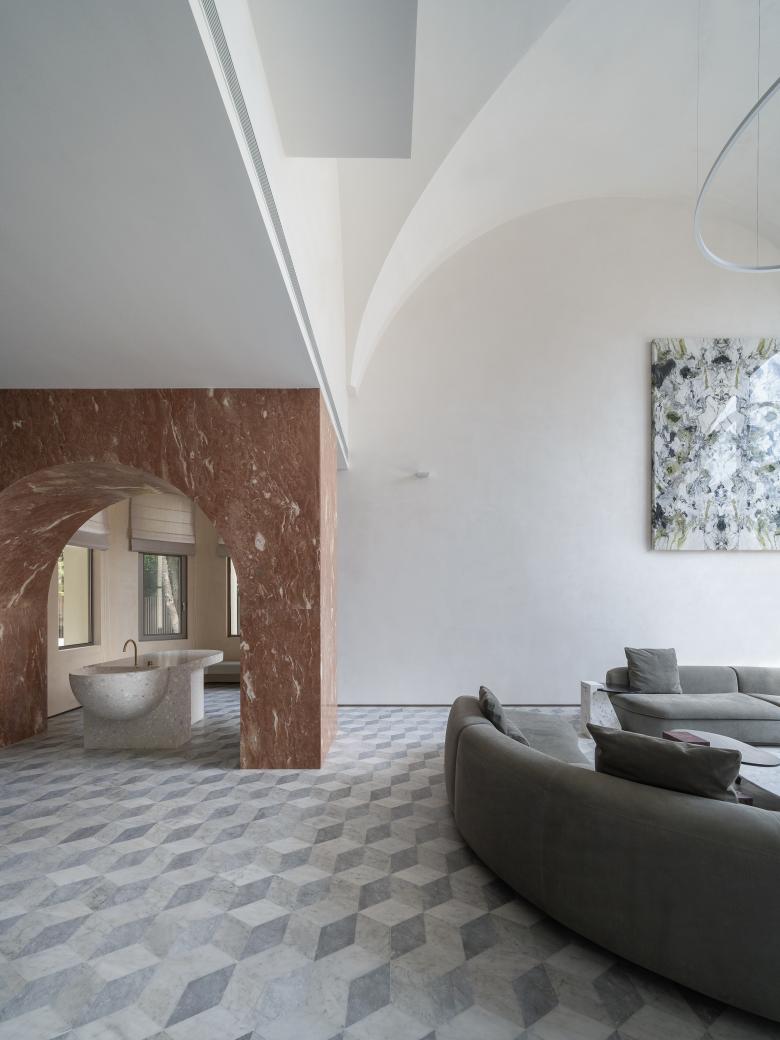 我们在门厅与茶室间插入符号化的拱门体块,作为茶室和门厅间虚拟的隔断;当人们从门厅望向茶室户外的树丛,拱门既是景框,也是视线的参照物。拱门也将客厅和客卫间的视线隔断,确保其私密性。