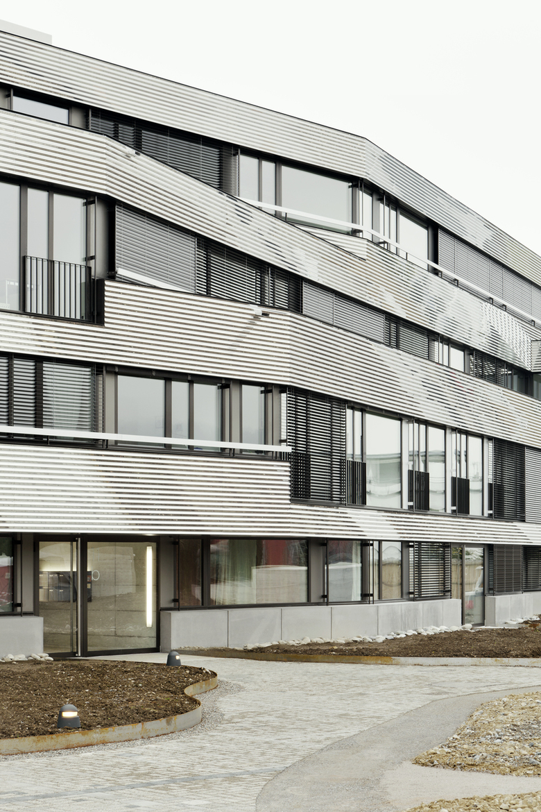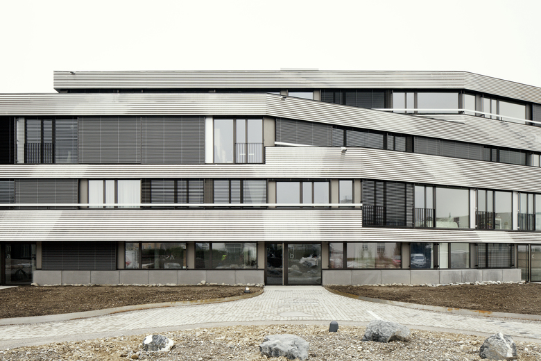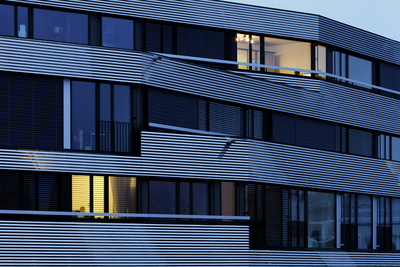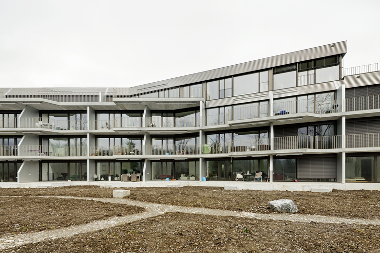 Das gesamte viergeschossige Wohngebäude orientiert sich in Richtung Fluss und Natur. Durch den Knick des Baukörpers wird das Volumen aufgebrochen und sowohl die Aussichten als auch die Beleuchtung optimiert. Jede einzelne der Durchsteckwohnungen verfügt über einen Blick auf den Fluss und erhält von zwei Seiten natürliches Licht. Die Kompaktheit des Baus und seine Platzierung nahe am Ufer lässt eine grosszügige Grünfläche für einen verspielten, naturnahen Garten frei.