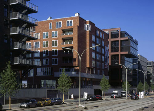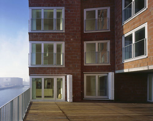 Neubau eines Wohngebäudes in der HafenCity mit einem großen offenen Treppenhaus und einer offenen, gemeinschaftlich genutzten Terrasse für die Bewohner. Wettbewerb 1. Preis.