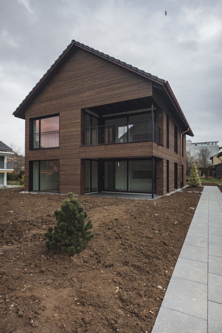 Die dunkelbraune Holzschalung und dunkelgraue Fensterzargen aus Metall geben den Gebäuden eine vornehmen zeitgemässen Ausdruck. Mit den eingezogenen Terrassen wird ein ruhiges Bauvolumen erreicht.