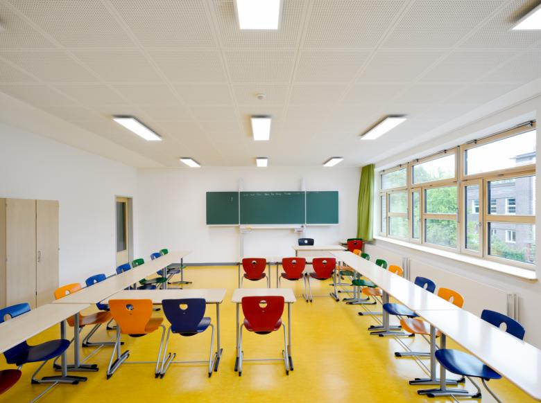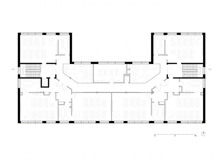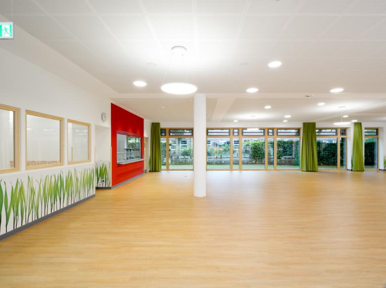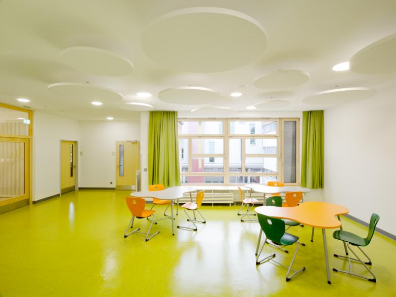 rimpf Architektur realisierte den vorgesehenen Zu- und Ersatzbau als Solitär auf dem freiwerdenden Baufeld nach Abriss des Gebäudes 02. Erdgeschossig wurden eine Mensa mit angeschlossener Cafeteria und Kiosk sowie die dazugehörigen Nebenräume geplant. Die Szenefläche in der Mensa erhielt ein fest eingebautes Podest. Im Obergeschoss befinden sich auf einer Ebene 6 Klassenräume mit je angeschlossenem Differenzierungsraum. Rimpf Architektur teilte die Flächen in Compartments < 200qm und konnte dadurch entlang der Fluchtwege Flächen für Sitznischen und großzügige sowie zentrale Lernzonen ausweisen.