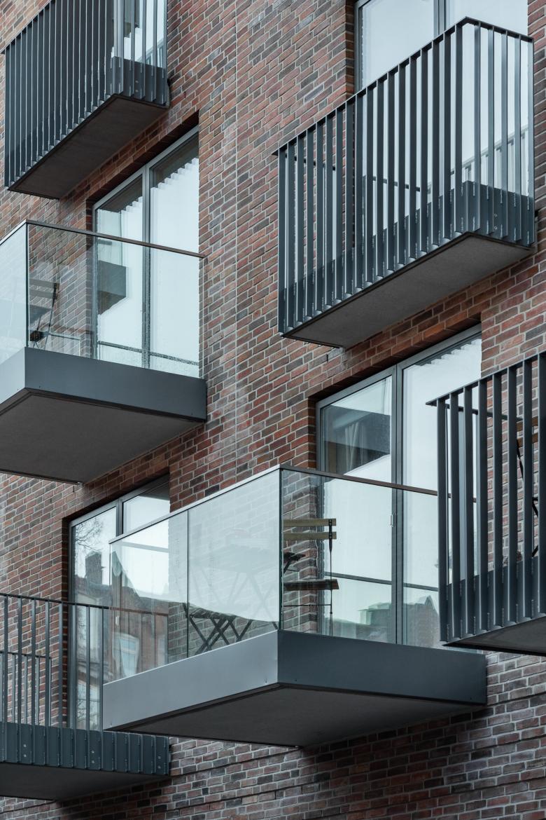 Das Gebäudevolumen ist aus der Umgebung abgeleitet, ebenso die Ziegelfassaden. Wohnbauten der Nachkriegszeit, mit einfach gegliederten Fassaden wechseln sich hier ab mit Bauten der Gründerzeit. Die Gebäude stehen im Wesentlichen traufseitig am Blockrand. Der Blockrand wird durch eine neue und strukturierte Baumreihe weitergeführt. Zurückversetzt wurde nun die Ziegelfassade mit um 90° verdrehten Satteldächern, die spielerisch mit asymmetrisch verlaufenden Giebeln das Dachthema der Umgebung aufnehmen. Die klar gegliederte Fassade mit wenigen, scheinbar zufällig arrangierten Panoramakuben als Interpretation der traditionellen Vorbauten und Erker des Kieler Stadtbildes bildet den Wohnungsmix ab und ist nur im Erdgeschoss für die Gewerbenutzung aufgebrochen.