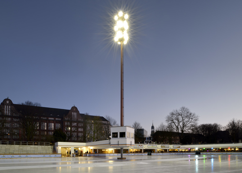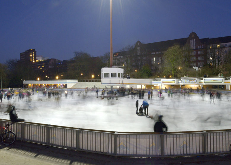 rimpf Architektur erhielt mit seinem Hamburger Architekturbüro nach einem vorausgegangenem VOF-Wettbewerbsverfahren den Auftrag einen vorliegenden Entwurf ab der Genehmigungsphase auszuführen. Aufgabenstellung war für unser Architekturbüro, neben der technischen und baulichen Sanierung die Erweiterung der beliebten Hamburger Anlage. Die Anlage, mit der sich viele Hamburger identifizieren sollte um ein Multifunktionsgebäude und eine neue Eishobelgarage zu Lasten der weitläufigen Tribünen erweitert werden. Der Architekturentwurf sah ferner ein Café als Erweiterung in den Park hinein vor und die Verlegung des Haupteingangs zum Zugang am Holstenwall.