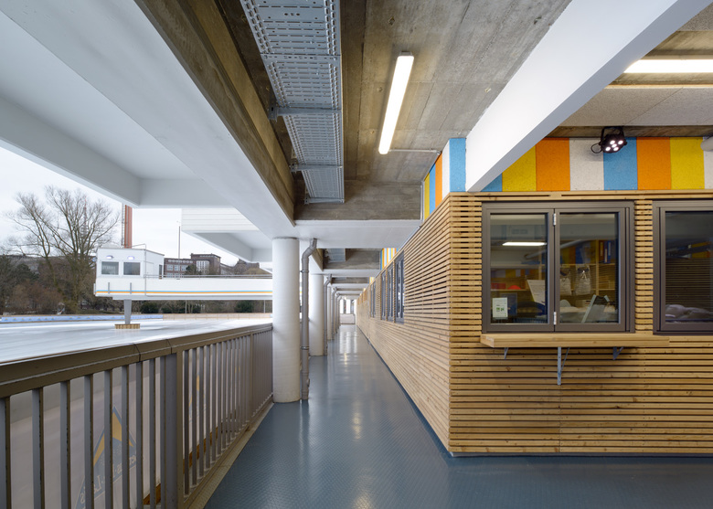 Der schwarzgrüne Gummi- Noppenboden ist ebenfalls als funktionales Bauelement zurückhaltend. Auffällig und bunt sind die historisch beibehaltenen Bilder der Balkonbrüstungen. Von rimpf Architektur wurde die Farbgestaltung übernommen. Das Büro hat für diese gefärbten Bauteile eine Anleihe an die Farbwelt der Olympischen Spiele in München 1972 gemacht. Die durchgängige Farbwelt des Farbbandes, der einzelnen Gefache der Rippendecken und der Sonnenschutzlamellen verklammert und verbindet die Bauteile zur Gesamtanlage.