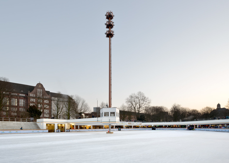 Die Kunsteisbahn wurde anlässlich einer Hamburger Gartenschau im Oktober 1935 gebaut; zur internationalen Gartenschau 1973 wurden die baulichen Anlagen ergänzt und in die Wallanlage integriert. Ein Café, dass wie der Neubau aus dem Hang heraus in den Park hineinragte wurde mit großem Volumen (Architekten unbekannt) projektiert- aber deutlich verkleinert gebaut.