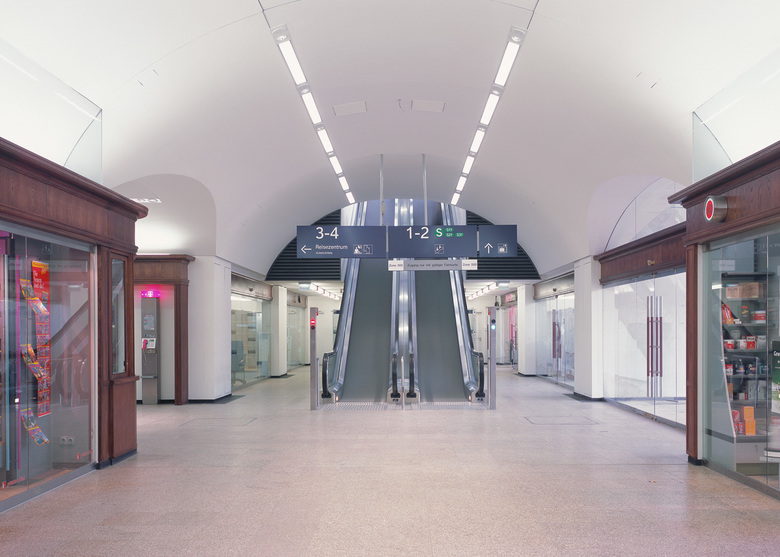 Behutsam und im Einklang mit dem Denkmalschutz wurde neben den Bahnsteigen insbesondere die Bahnhofshalle erneuert. Auf der mehrseitig betretbaren Erdgeschossebene sind hölzerne Einbauten entstanden, in welchen Shops beherbergt sind. Diese werden von einer Gewölbedecke überspannt, was dem gesamten Empfangsbereich eine edle Optik verleiht. Auf 6.500 m² präsentiert sich nun eine völlig neue Bahnhofswelt, welche die historische Bausubstanz mit zeitgemäßen Architekturelementen vereint.