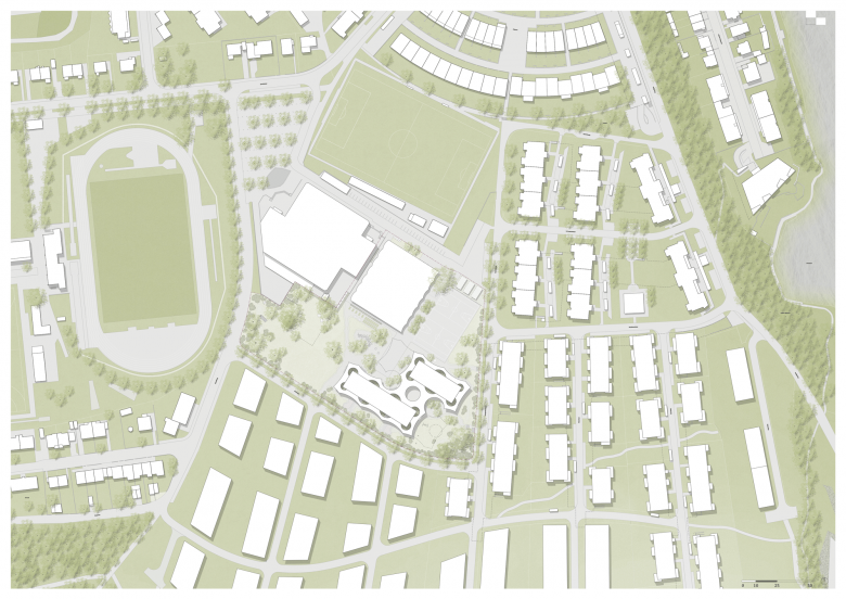 Im Süden der Stadt Olten gelegen, war das Kleinholz lange Zeit von den grossflächigen Nutzungen der Sportanlagen und des Schiessstandes bestimmt. Davon zeugen auch die beiden grossmasstäblichen Bauten der Eishalle und der Stadthalle, die als frei in diesem weiten Feld schwimmende Solitäre in Erscheinung treten. In jüngster Zeit erfährt das Kleinholz nun eine rasante Entwicklung mit der Umwidmung der freien Flächen, die künftig vor allem mit Wohnhäusern bebaut werden sollen. Damit entsteht einer neuer Stadtteil von Olten. Die inmitten der neuen Bebauungen vorgesehene Schulanlage soll dazu beitragen, einen Ort zu schaffen, an dem sich die Bevölkerung auch ausserhalb der Schulzeiten treffen kann. Sie ist das eigentliche Herzstück des neuen Quartiers und ist als einladende und offene Anlage mit einem inneren kleinen Park und umgebendem Grün konzipiert. Die Wegführung durch die Anlage, von Nord nach Süd entlang der Turnhalle unter deren ausladendem Dach und von Ost nach West, durch das Schulgebäude hindurch, vernetzt die umliegenden Quartierteile miteinander. Das neue Schulhaus wird damit zum Dreh- und Angelpunkt.