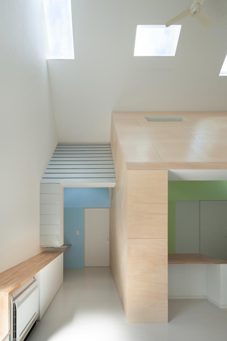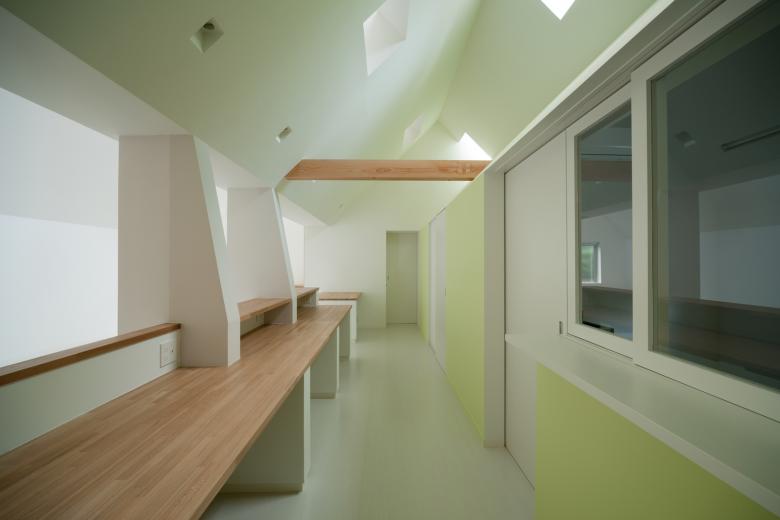 複数のトップライトを設けた北側の大きな屋根面は、開口を開けることで弱くなり、補強が必要となる。調剤室・スタッフルーム・受付・トイレ・洗面室などの諸室を様々なサイズの家型のボリュームとし、これらで、北側の屋根面を補強してくこととした。エントランスや特別待合室も同じように家型で構成し、大小様々な家型のボリュームが入れ子状に集まった構成とした。