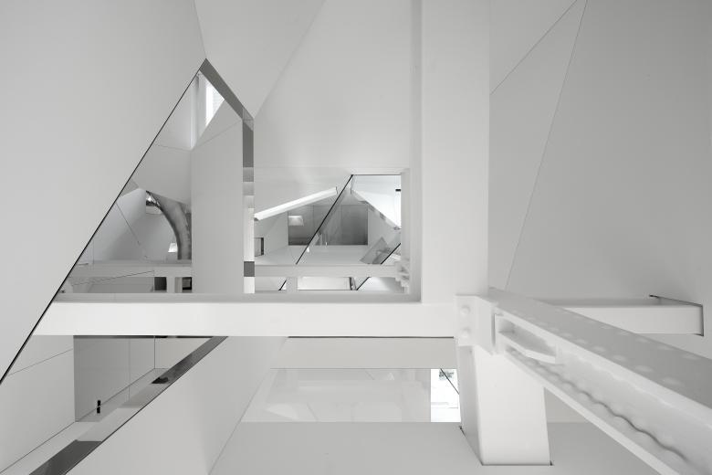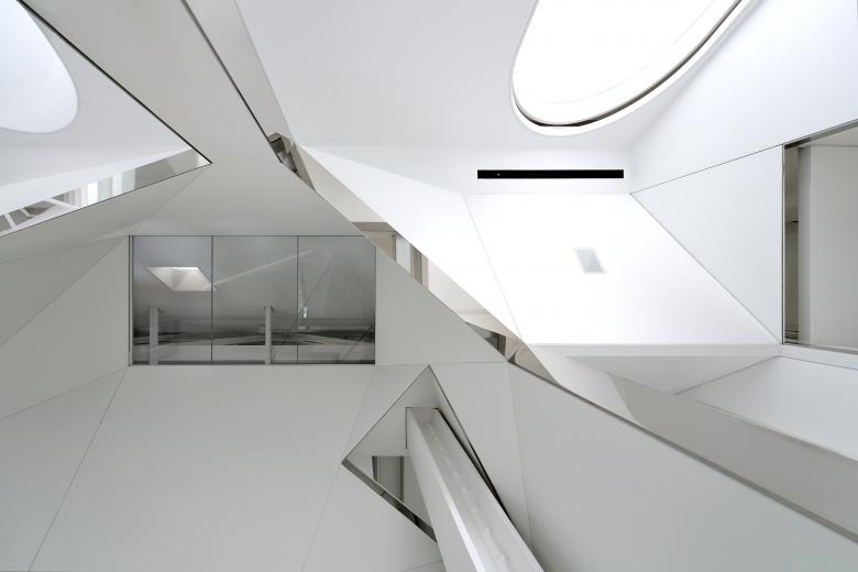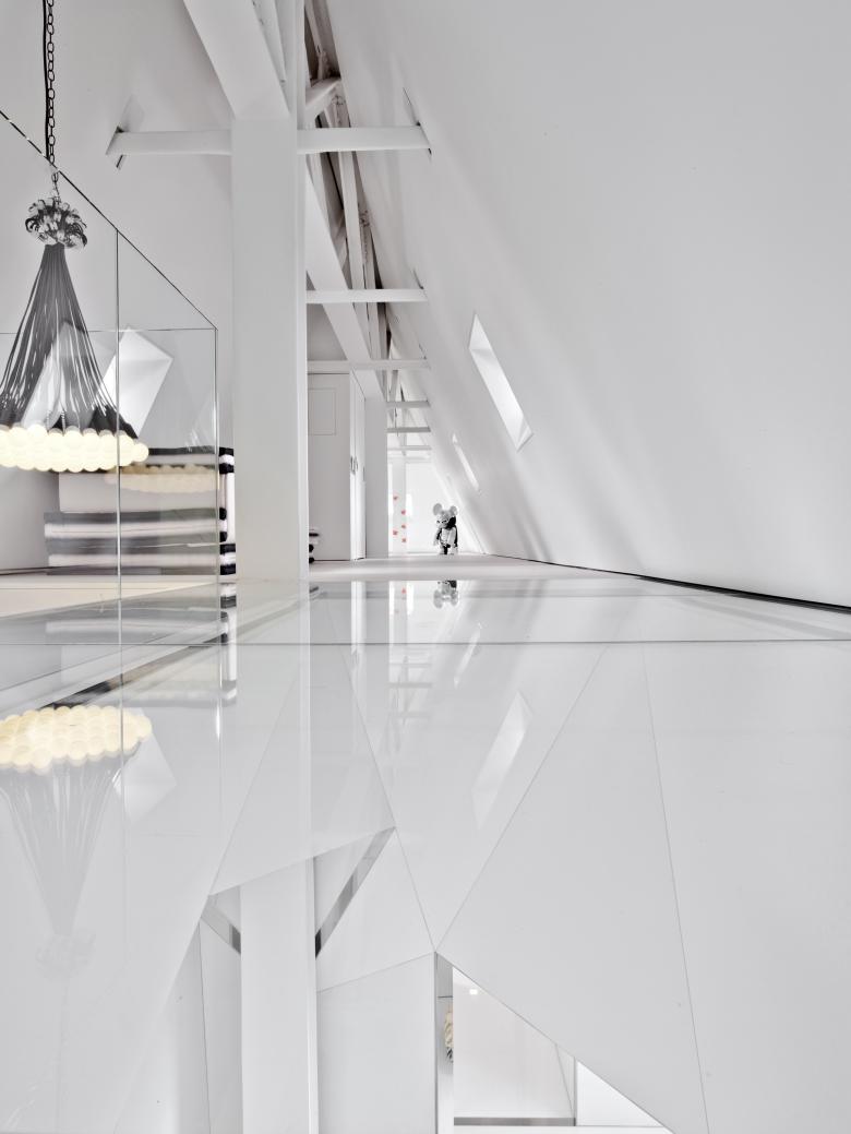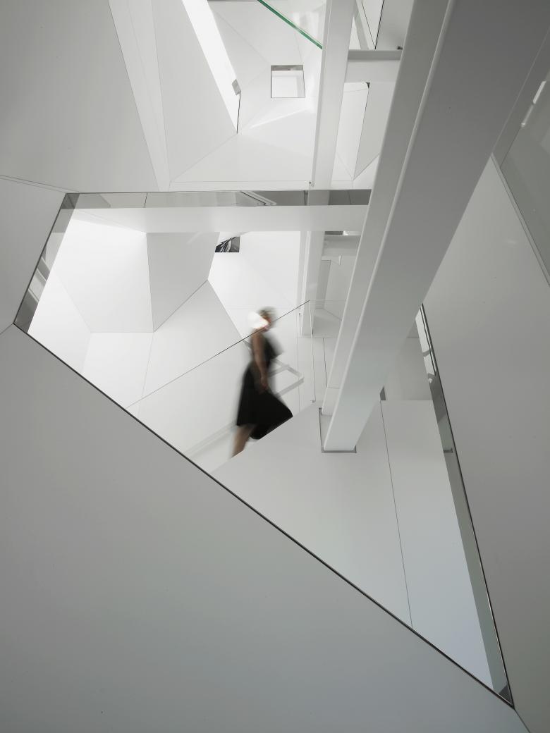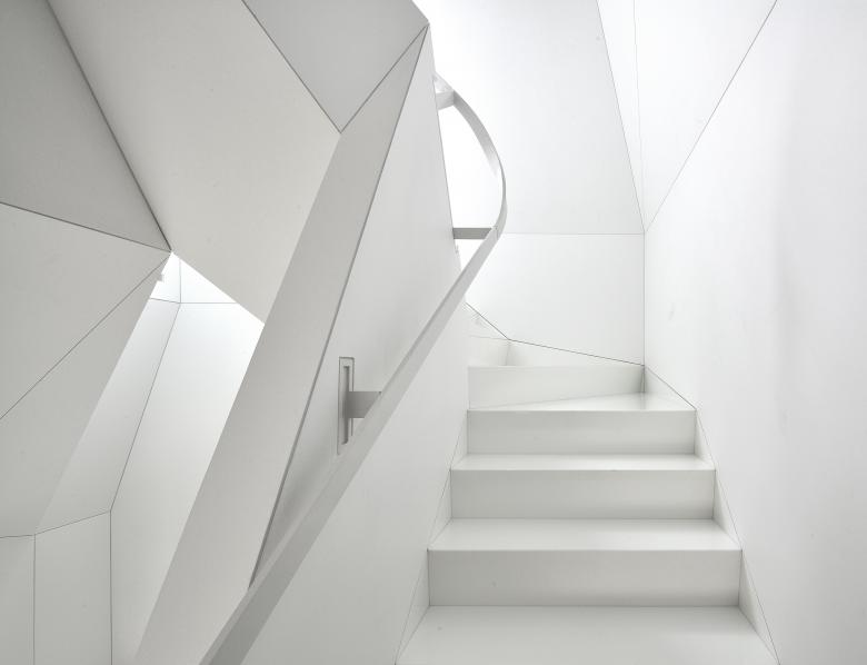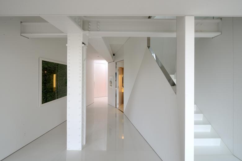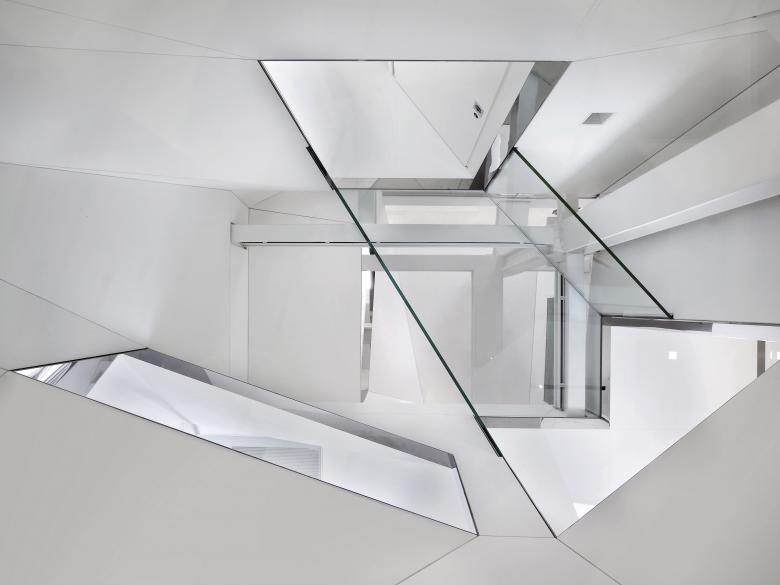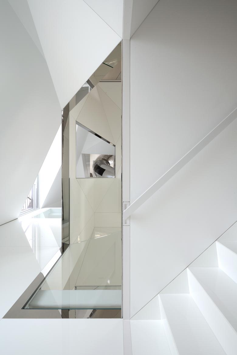 The private elevator landing opens into a tall vestibule, tapering upward to a seamless rectangular oculus which provides a view of the sculpted summit of the adjacent skyscraper. From the elevator vestibule, the floor slopes gently upward passing under the twisting shaft of the stairwell to arrive at the main level of the penthouse.The stairwell ascends through the full height of the penthouse, linking the entry hall with the structural glass floor of the attic level four stories above. The original riveted steel structure threads through the faceted stairwell and past a structural glass bridge which spans the stairwell at the third level.