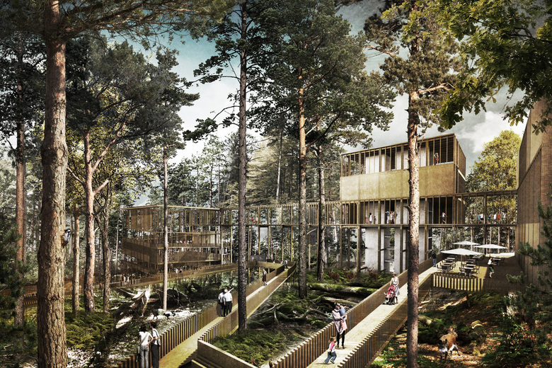 Der Schwarzwald ist Deutschlands höchstes und größtes Mittelgebirge und bildet mit dem Nordschwarzwald das größte zusammenhängende Waldgebiet Baden-Württembergs. Im Januar 2014 wurde der Nationalpark Schwarzwald entlang der Schwarzwaldhochstraße auf den Höhen zwischen Plättig und Alexanderschanze auf einer Fläche von ca. 10.000 ha gegründet.Rund um den Ruhestein sollen ein Besucher- und Informationszentrum, sowie die Nationalpark-verwaltung als zentrale Anlaufstelle etabliert werden. Unter dem Motto „ Natur Natur sein lassen“ soll sich im Nationalpark Schwarzwald wieder eine Urlandschaft mit den typisch heimischen Arten entwickeln. Im 18. Jahrhundert gab es im Schwarzwald noch einen lebendigen Wald aus Tannen, Buchen und wenigen Fichten. Aufgrund der starken Abholzung im 19. Jahrhundert und damit einhergehenden Gefahren eines solchen Kahlschlags, wurden allerdings große Monokulturen aus Fichten angebaut, die bis heute das Landschaftsbild des Schwarzwaldes prägen. Ziel des Nationalparks ist die Überleitung aus diesem fichtendominierten Wirtschaftswald in einen Urwald, in dem die Natur sich selbst überlassen ist. Der natürliche Lebenskreislauf der Wälder wird wieder zugelassen, viele Tier- und Pflanzenarten, die auf diesen natürlichen Kreislauf angewiesen sind, finden hier wieder ihren sehr selten gewordenen Lebensraum. Der Mensch soll diesen Prozess beobachten können, dabei aber nicht störend einwirken. Aus diesem Grund müssen die Eingriffe im Bereich des Besucher- und Informationszentrum möglichst sensibler und extensiver Natur sein. Konzept Nationalparkzentrum Das Heranführen des Besuchers an den Wald soll auf ungewöhnliche Weise und über ungewohnte Perspektiven erfolgen. Ein Basisgebäude als Informationszentrum bildet den Auftakt der Anlage und ist erste Anlaufstelle für den Besucher. Über ein grosszügiges Foyer werden aktuelle Wechselaustellungen, das Kino, der Schulbereich und die „Waldschänke“ unmittelbar auf kurzem Wege erschlossen. Besonderes Interesse wird der Ausblick auf die „Waldvitrine“ als gläserner Ausstellungsbaukörper in den Baumkronen erwecken. Er ist der innenräumliche Auftakt des naturnahen Austellungsbereichs, welcher durch den „Wipfelsteg“ mit aussergewöhnlichen und ungewohnten Ausblicken im Freien seine Fortsetzung im Aussenbereich erfährt. Zielpunkt des Wipfelstegs und Endpunkt der gebäudeinternen Erschliessungsachse ist das „Waldfernrohr“ ein Aussichtspunkt, der dem Besucher den Blick über die Baumwipfel und den Nationalpark Schwarzwald eröffnet. Von diesem Aussichtspunkt setzt sich der Naturerlebnisparcours über die „Baumrampe“ fort. Sie ist der Auftakt der Aussenraumaustellung, wo vermittelte Inhalte in der „Waldvitrine“naturnah nachvollzogen und wiederentdeckt werden können. Die behindertengerechte Rampenanlage führt den Besucher um eine Baumgruppe von Wipfel über Kronenbereich bis zum bodennahen Gehölzbereich. Podeste laden zum verweilen ein und eröffnen immer wieder verschiedenste Blicke in den Wald und auf die Anlage. Über Informationsstelen wird sichtbares immer wieder didaktisch aufbereitet. Nach Austritt aus der Baumrampe setzt sich der Parcours über den “Waldsteg“ in das Dickicht des Waldes fort. Aufweitungen des Waldsteges bilden auch hier Verweil- und Ausstellungsbereiche. Über grossformatige Tafeln wird der Besucher über die im Kontext der Umgebung stehenden Themenschwerpunkte informiert. Inmitten des Waldstegverlaufs kann der Besucher diesen verlassen und einen Ort der Stille aufsuchen, den „Waldkonkon“, eine begehbare, hölzerne Rauminstallation mit zielgerichtetem Ausblick in den Wald. Die serpentinenartig angeordnete Steganlage führt den Besucher abschliessend auf die Aussenterrasse der „Waldschänke“, welche zu einem gastronomischen Ausklang des Rundgangs einlädt. Gleichermassen ist über einen separaten Eingang der Zugang zu Garderoben und Foyer barrierefrei sichergestellt.