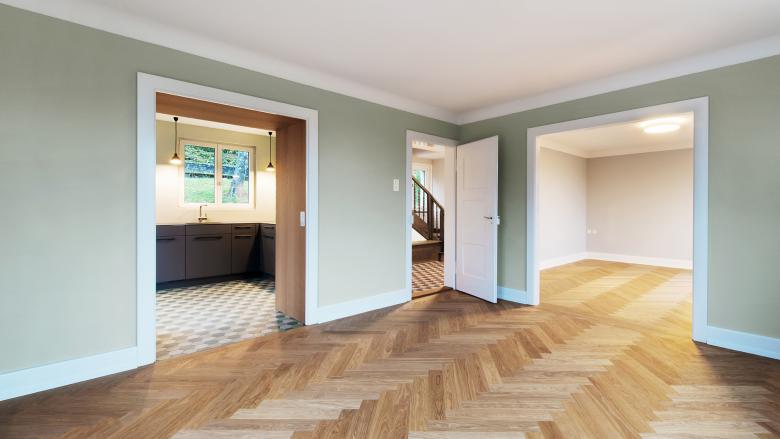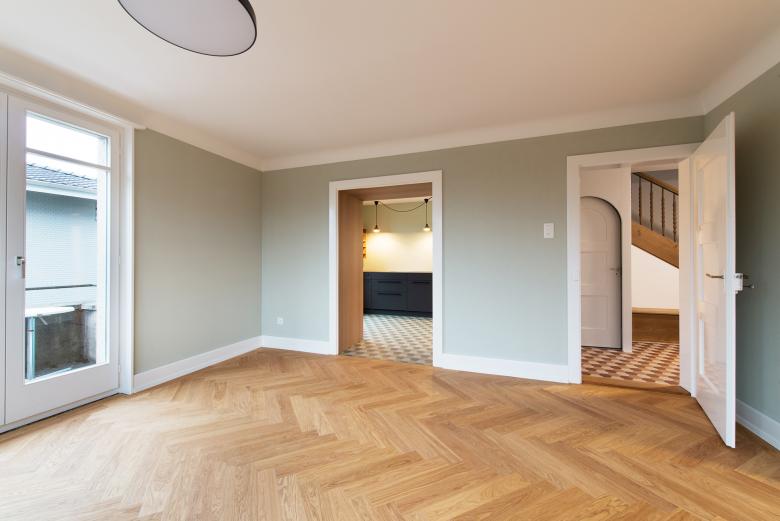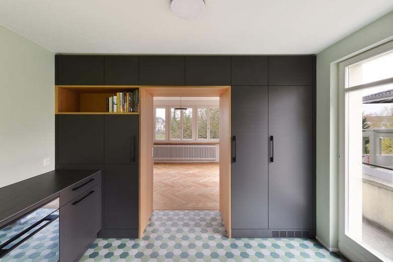 Neue Bodenbeläge ein Fischgrätparkett in Eiche und farbige Keramikplatten, stellen einen zeitgemässen Bezug zur Bauzeit des Bürgerhauses her und ersetzen den alten Teppichbelag. Neue Wanddurchbrüche schaffen Grosszügigkeit zwischen Küche, Wohn- und Essbereich. Die neue anthrazite Küche setzt im Haus den modernen Akzent.