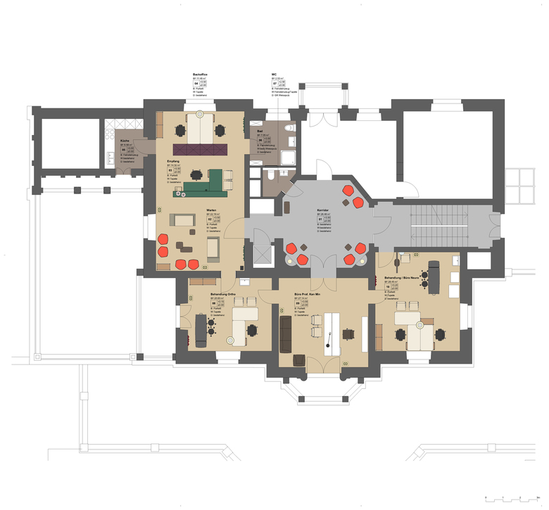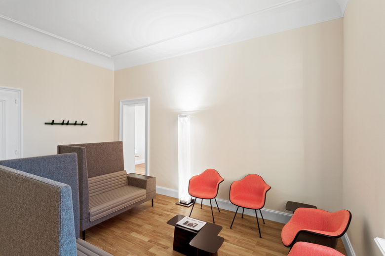 In der denkmalgeschützten Villa Moskwa der Klinik im Park sollte eine Praxis mit Empfang- und Wartebereich, einem Büro und 2 Behandlungsräumen umgebaut werden. Ziel von uns war es, die Farben und Materialien so zu wählen, dass sie sich gut in die bestehende Substanz integrieren und ein harmonisches und ruhiges Ambiente entsteht.