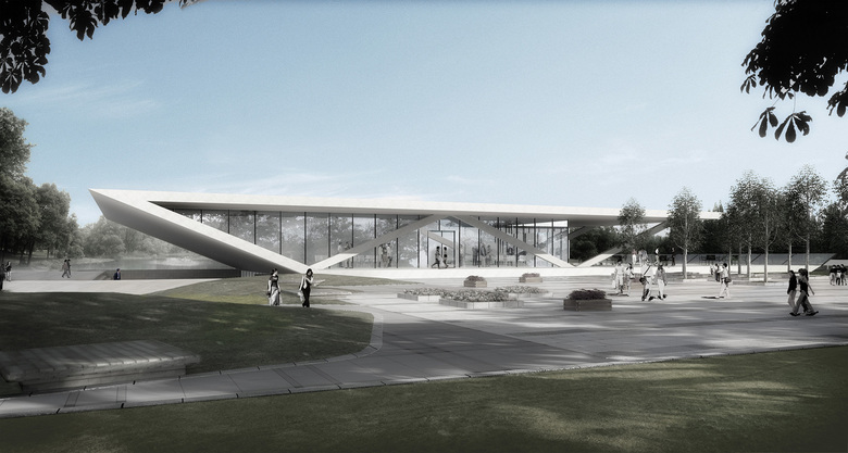 Das Untergeschoss mit seinem Zugang und seinen Freiflächen ist in Form einer Senke in die Landschaft eingegraben. Über diese Senke legt sich der "Pavillon" mit Teahouse und Shopflächen wie ein eigenständiger Baukörper. Das Gebäude öffnet sich mit großzügigen Terrassen nach Süden, weit ausladende Vordächer sogen für Verschattung.