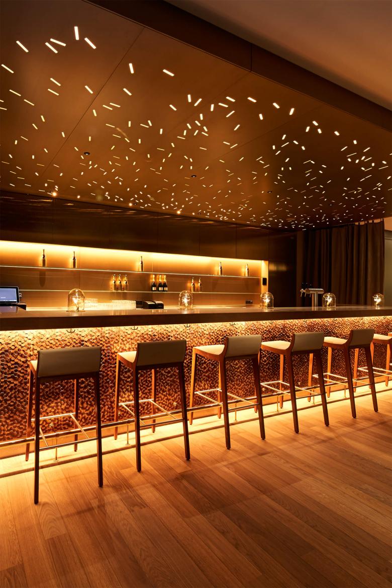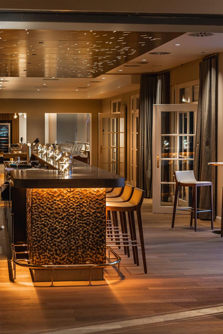 Was früher der Schmied ist heute der Barkeeper: ein echter Kerl! Ja, wir sind in einem Landhaus. Aber nein, Pferde gibt es nicht mehr am Gutshof Treudelberg, aber dennoch Feuer! Der neue Schmied trägt ein weißes Hemd mit Fliege unter der Lederschürze und zaubert das Feuer in die Drinks seiner goldglühenden Bar. Das Motiv des Funkenfluges zeichnet das Lichtspiel über der Bardecke. Die golden schimmernde Rückwand der Bar spiegelt den Ausblick in den Park nach innen und taucht ihn in ein warmes Licht. Für die Thekenverkleidung wurde eine individuell gelaserte Oberfläche mit 3D- Effekt entwickelt und handwerklich mit Goldtönen patiniert. Für große Freundeskreise kann sich die Bar in Richtung Restaurant erweitern. Für intime Abende schafft ein trennender Vorhang eine heimelige Nische mit Blick auf den Kamin in der Lobby.