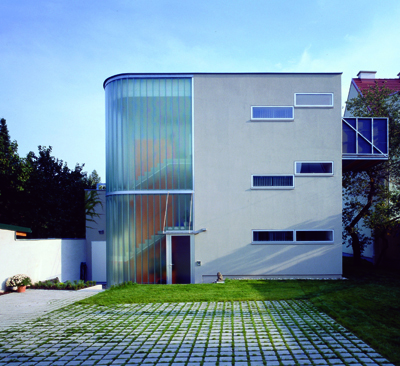 Die Situation eines lang gezogenen Grundstücks in einem typischen Straßendorf erlaubte die Errichtung von zwei Häusern, die sich einen gemeinsamen Innenhof teilen. Die beiden Häuser werden von einer therapeutischen Wohngemeinschaft genutzt. Im straßenseitigen Haus wohnen betreute Jugendliche, im hofseitigen Haus die Betreuerfamilie. Die relativ geschlossene Straßenfront des vorderen Hauses in schwarzen Schieferplatten nimmt die Konturen der Nachbarhäuser auf, verfremdet diese jedoch in einem neuen Material.