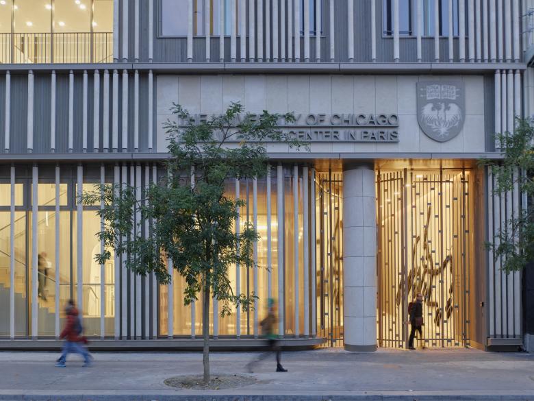 The building’s defining feature is a brise soleil façade composed of approximately 900 cylindrical batons. The stone batons function as a filtering screen whose porosity responds to the program within, densifying around private spaces for study and research and opening to reveal activity in public and event spaces. Each baton is enrobed in Lutetian limestone, a stone that underlies much of the Paris region and has been a common local building material since antiquity. Limestone links the building to the University’s main campus in Chicago, where it is also a prominent building material, while simultaneously rooting it to the history of Paris.