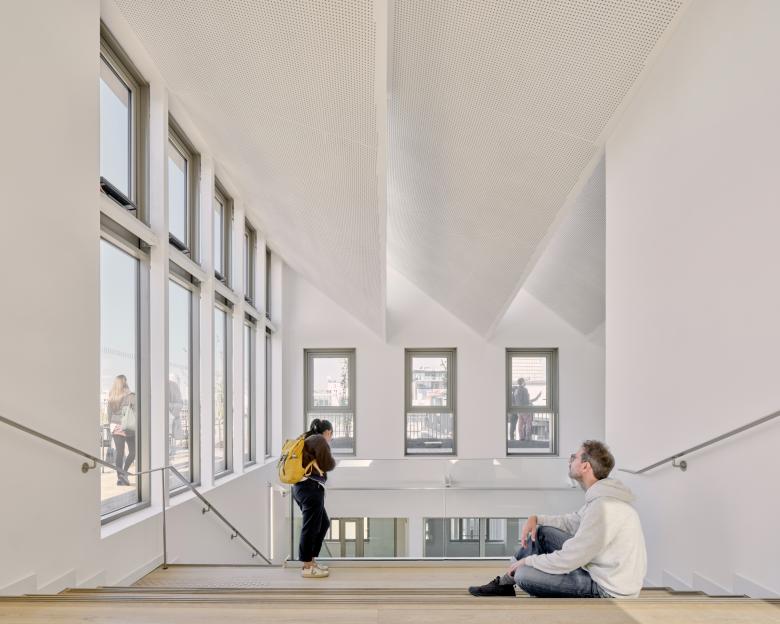 The 25,460 sf (2,365 sqm) building is designed as a vertical campus, with learning and research areas wrapping around a central atrium that connects spaces both physically and visually. Outdoor spaces—including a shared courtyard, a loggia, and a series of terraces—provide places for socializing, study, and rest as well as access to nature and a habitat for urban wildlife. Nine classrooms, including a laboratory teaching space, support academic activities, while a research institute provides a home base for visiting academics.