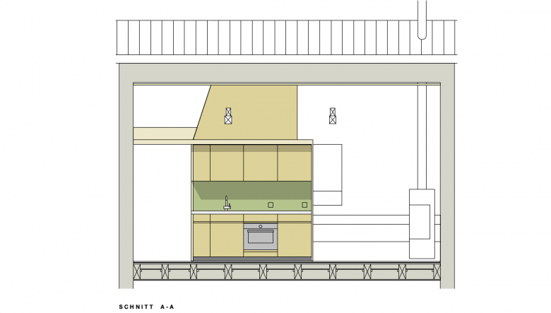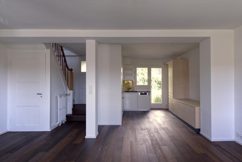 Begleitend zur Aufwertung des Dachgeschosses wurde im Erdgeschoss die Trennwand zwischen Küche und Wohnen geöffnet. Die Küche wurde durch ein Sideboard mit angegliederter Garderobe ergänzt, ebenfalls in Birkensperrholz materialisiert. Der Boden wurde mit dem gleichen Parkett aus geräucherter Eiche belegt wie der Dachraum.