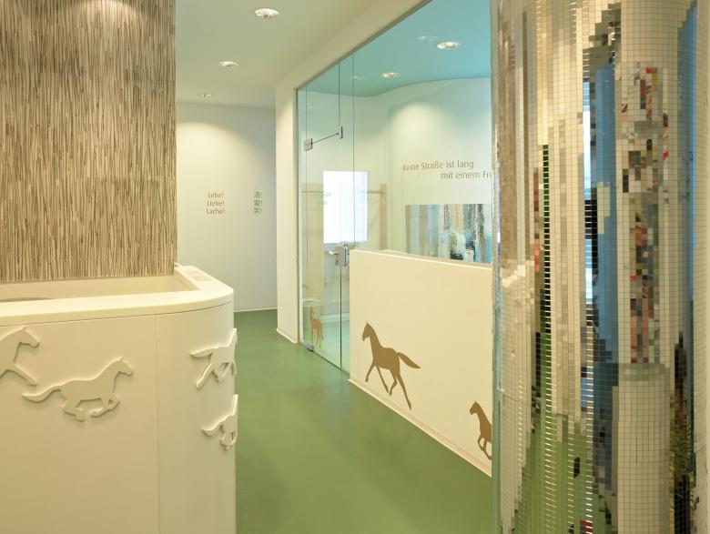 Die Arztpraxis für einen Kinderarzt und eine TCM-Ärztin stellte einen Balanceakt dar: einerseits Kinder und das pralle Leben, andererseits Erwachsene und Ruhe. Die Praxis zeichnet sich durch ihren ausgeklügelten Grundriss und die Verwendung innovativer Materialien aus. Klare Formen und Farben, gepaart mit individuellen Details, runden den Entwurf ab. Frische Farbigkeit bestimmt den Gesamteindruck der Praxis, wogegen sanfte natürliche Farbtöne den TCM Bereich prägen und Ruhe ausstrahlen. Die individuelle grafische Gestaltung zieht sich durch die gesamten Räume. Daneben wurde der hohe Anspruch an die Hygiene in besonderem Maß erfüllt, ohne steril zu wirken. Sowohl den Bedürfnissen von Kindern und Jugendlichen, als auch Erwachsenen wird in einem überzeugenden Gesamtauftritt begegnet.